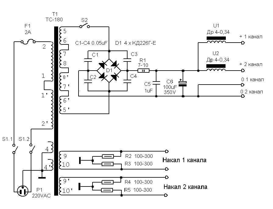 Блок питания выполнен на ТС-180, диодах КД226, для уменьшения фона при применении выходных лампам с разными токами анода установлены дроссели, если лампы подобраны, то можно обойтись без дросселей.