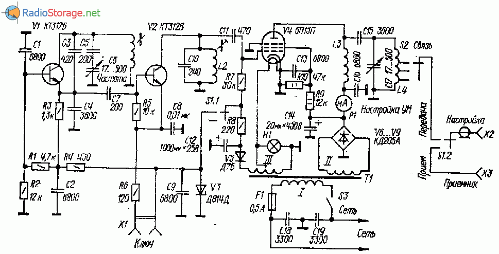 Для питания выходного каскада применен выпрямитель, собранный по мостовой схеме на диодах V6 — V9. Он обеспечивает постоянное напряжение +300 В. Низковольтная обмотка III трансформатора Т1 составлена из двух обмоток накала, соединенных последовательно. С одной обмотки напряжение подается на нить накала лампы V4 и на сигнальную лампу Н1 (она освещает шкалу передатчика).