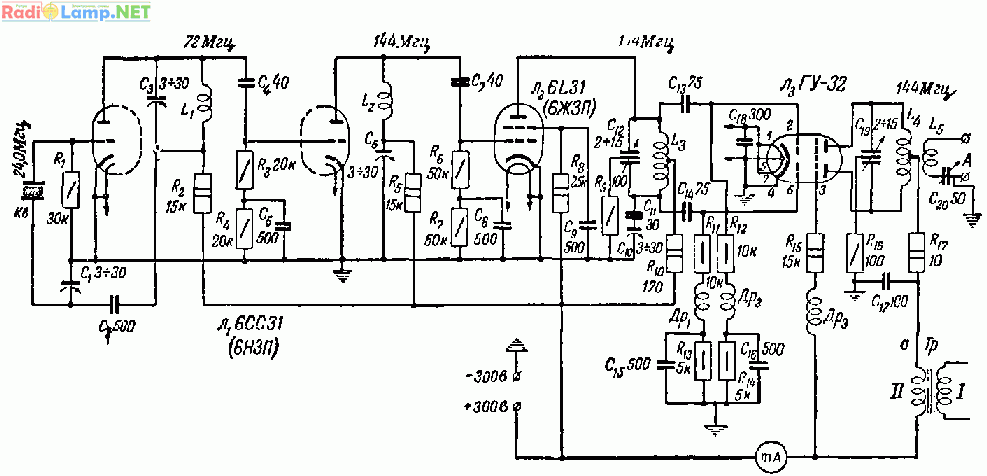 Рис. 1. Принципиальная схема лампового УКВ генератора на 144МГц.