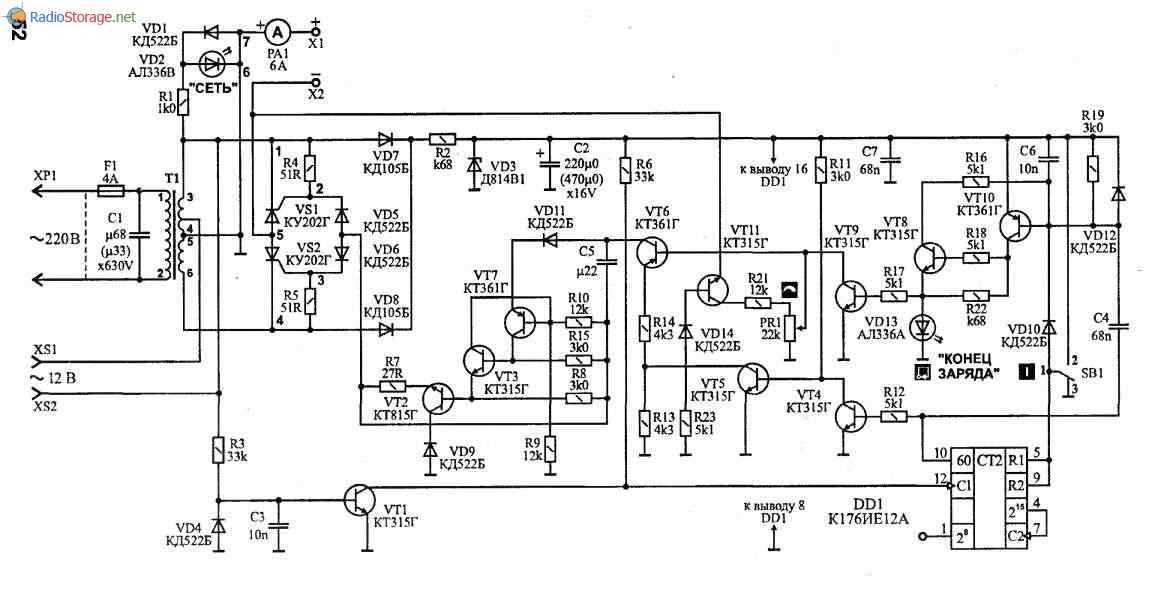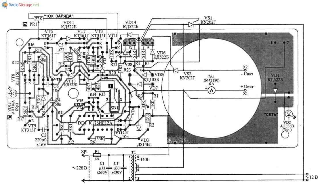 Выпрямленное напряжение подается на аккумуляторную батарею через контакты X1 («плюс») и Х2 («минус»). Для контроля величины тока заряда служит индикатор тока РА1.