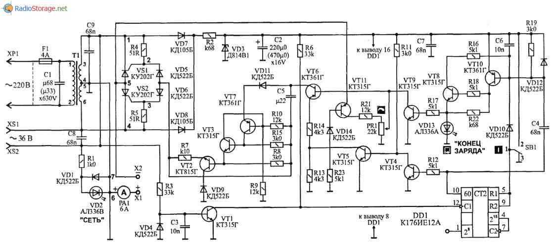 Для отключения цепи заряда от аккумулятора через 10,5 ± 1 час, управления работой тиристоров и установки необходимого тока заряда служит схема, собранная на транзисторах VT1 + VT11 и микросхеме DD1.
