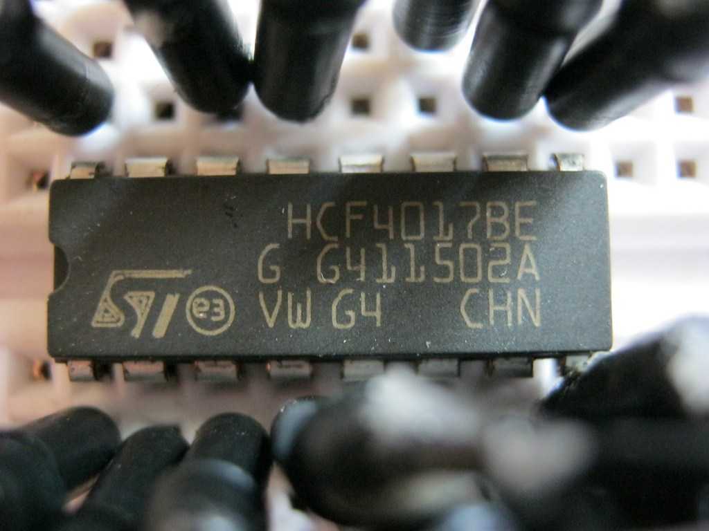 (зарубежный аналог CD4017) является десятичным счетчиком с дешифратором. В своей структуре микросхема имеет счетчик Джонсона (пятикаскадный) и дешифратор, позволяющий переводить код в двоичной системе в электрический сигнал появляющийся на одном из десяти выходов счетчика.