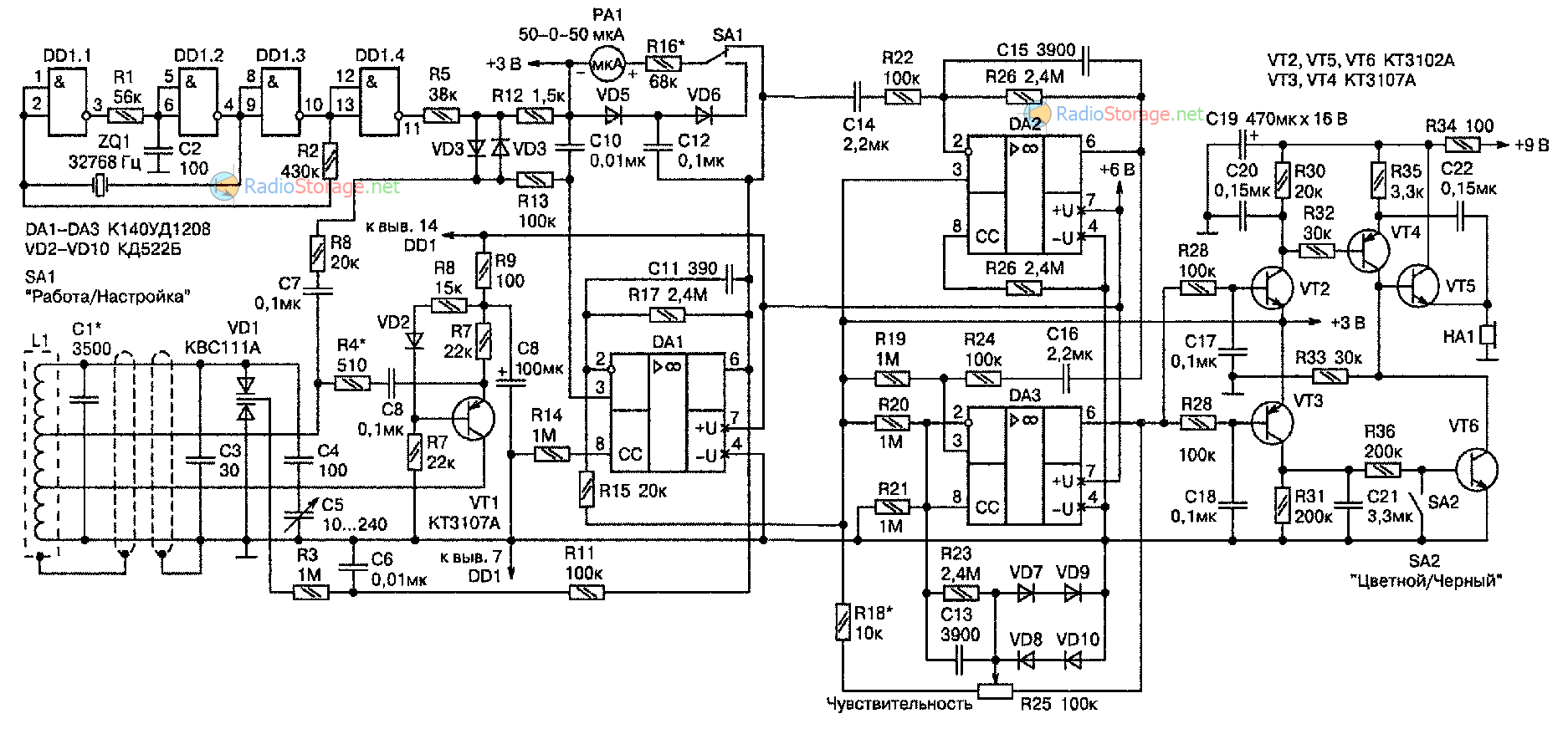 Микроамперметр РА1 с добавочным резистором R16 служит вольтметром, измеряющим постоянную (переключатель SA1 в положение «РАБОТА») или переменную (в положении «НАСТРОЙКА») составляющую напряжения на выходе DA1. Первое позволяет уточнить положение обнаруженного предмета, второе — зафиксировать моменты синхронизации генераторов и ее срыва.