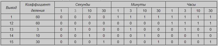 Частота генератора импульсов задается RC-цепью R2-C1, затем эта частота делится счетчиком. Коэффициент деления счетчика зависит от включения его входов (таблица 1). В данном случае выдержка времени получается около 30 минут, но её всегда можно изменить как подбором параметров цепи R2-C1, так и изменением подключения выводов согласно таблице 1. Как уже сказано, датчиком включения осветительного прибора служит фоторезистор FR1, вместе с резистором R1 он образует делитель напряжения. Резистором R1 устанавливают такое состояние, чтобы при выключенном свете и закрытой двери на выводе 2 D1 было напряжение логического нуля.
