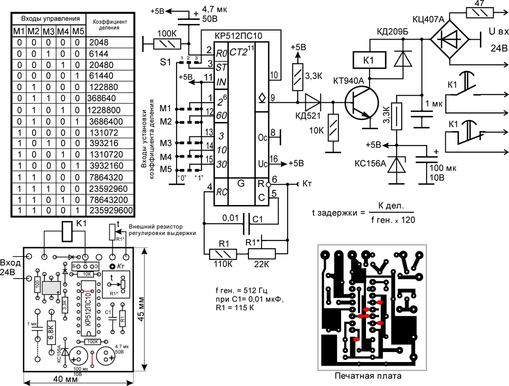 Кравцова Виталия Николаевича. Представленные конструкции уникальны. Реле времени широко применяются в быту и промышленной автоматике для получения задержки включения или отключения различных устройств, в схемах сигнализации, в различных бытовых приборах для ограничения времени работы этих устройств, если забыли их выключить. Данные устройства можно использовать для отключения освещения в ванной комнате или туалете через заданное время, автоматического отключения дежурного освещения в подъезде дома или гараже, включения охранной сигнализации через некоторое время, после того, как Вы покинули охраняемый объект, в качестве таймера газовой или электроплиты, чтобы не забыть про оставленный пирог, автоматического отключения электроутюга и т. Как правило, в схемах реле времени используют специализированные микросхемы — счётчики с предустановкой коэффициента деления и встроенным задающим генератором, что позволяет изменять параметры устройства в очень широких пределах.