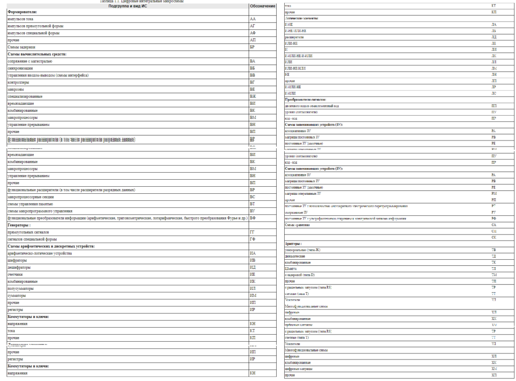 В соответствии с принятой системой (ОСТ 11073915 — 80) обозначение ИС должно обязательно содержать четыре элемента. Первый элемент обозначения — цифра, указывающая группу микросхемы по конструктивно-технологическому признаку: 1, 5, 6, 7 — полупроводниковые; 2, 4, 8 — гибридные; 3 — прочие (пленочные, керамические, вакуумные и т. д.). Второй элемент — две цифры, указывающие номер разработки данной серии. Первый и второй элементы обозначают серию микросхем. Третий элемент — две буквы, обозначающие функциональную подгруппу и вид микросхемы таблица. Четвертый элемент порядковый номер разработки микросхемы в серии среди микросхем одного вида. При необходимости в обозначение также могут быть введены дополнительные буквенные индексы от А до Я, определяющие допуски на разброс параметров ИС и т. п.. Подробнее классификация микросхем показана в таблице.