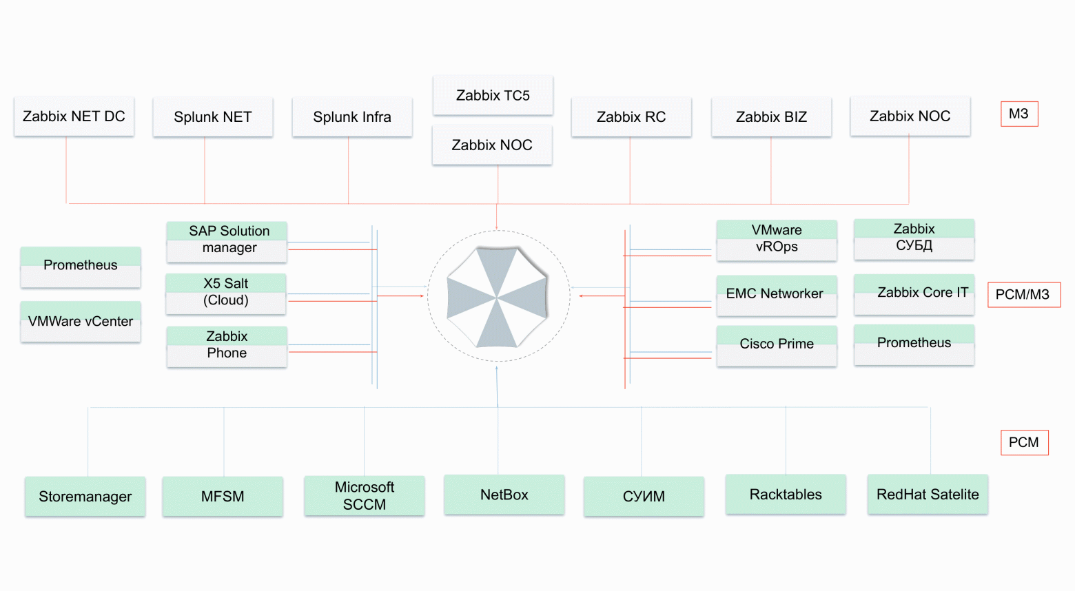 системы мониторинга, которые не содержат никакой инвентарной информации и дают только огромное количество метрик, — их мы потом связываем с ресурсно-сервисной моделью: здесь много различных Zabbix, несколько инсталляций Splunk и др.;