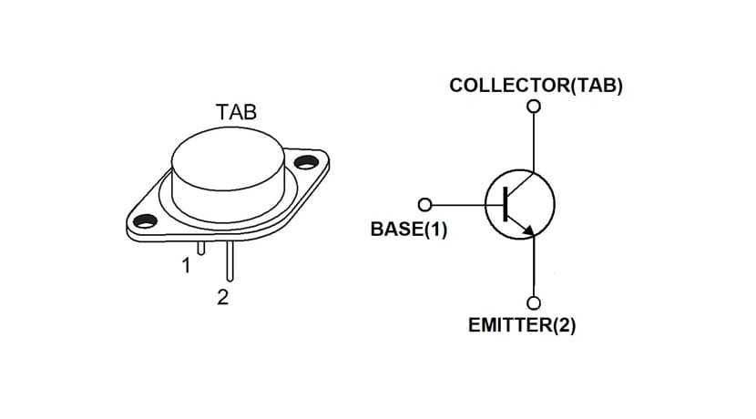 Как и другие транзисторы, El 2N3055 имеет 3 подключения для эмиттера, базы и коллектора. Мы уже обсуждали это в других статьях о транзисторах. Поэтому ноль сомнений в распиновке этого NPN транзистора. Конфигурация аналогична контакту 1 для базы, который будет использоваться в качестве переключателя для тока, проходящего через полупроводник или нет, контакт 2 является эмиттером (обычно соединенным с GND или землей), а коллектор, который на самом деле является TAB так как третьего пина нет (нормально подключен к питанию).