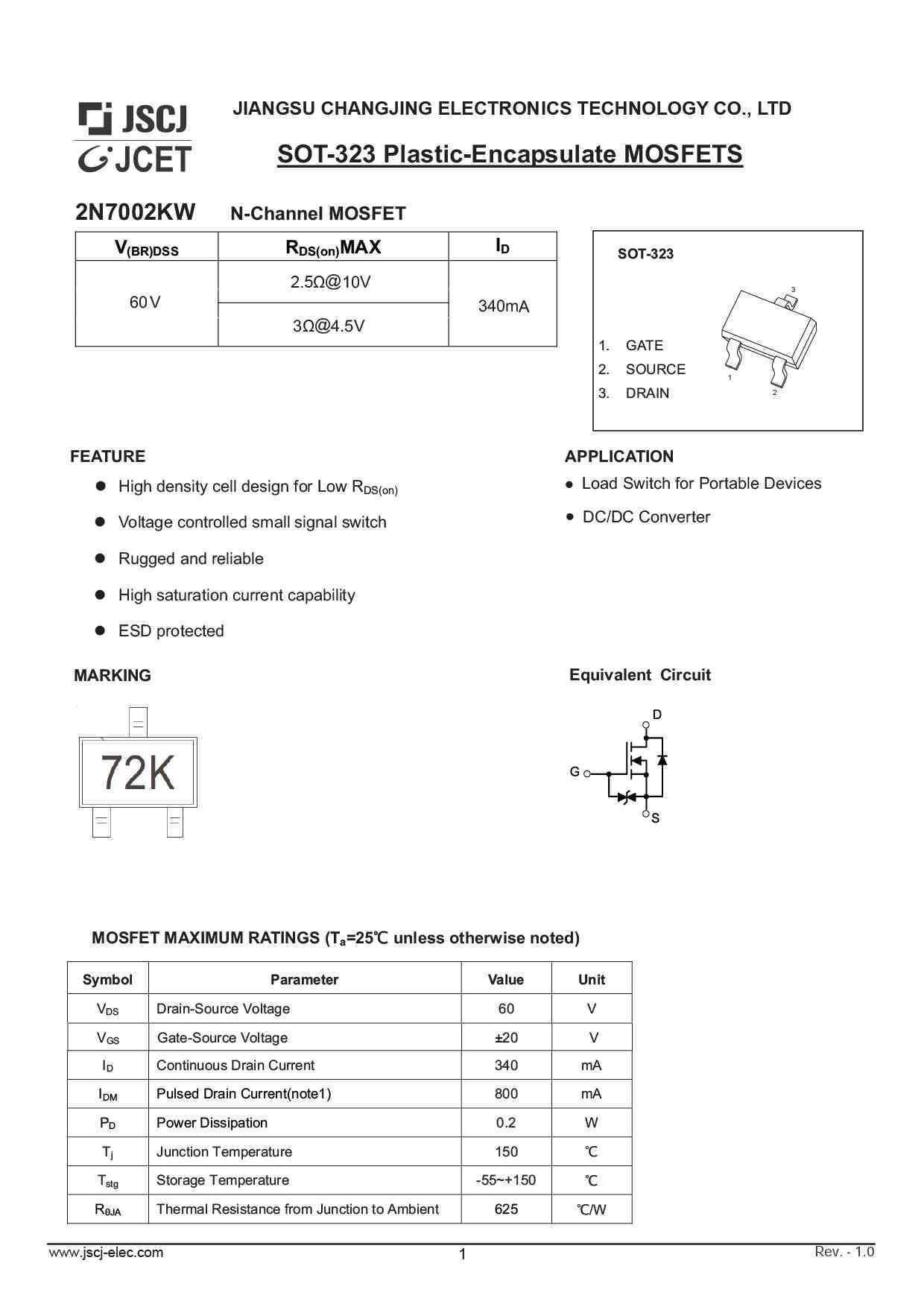 JIANGSU CHANGJING ELECTRONICS TECHNOLOGY CO., LTD SOT-323 Plastic-Encapsulate MOSFETS2N7002KW N-Channel MOSFETID V(BR)DSS RDS(on)MAX SOT-323 2.5 3 1. GATE2. SOURCE123. DRAINFEATURE APPLICATION High density cell design for Low RDS(on) Voltage controlled sm