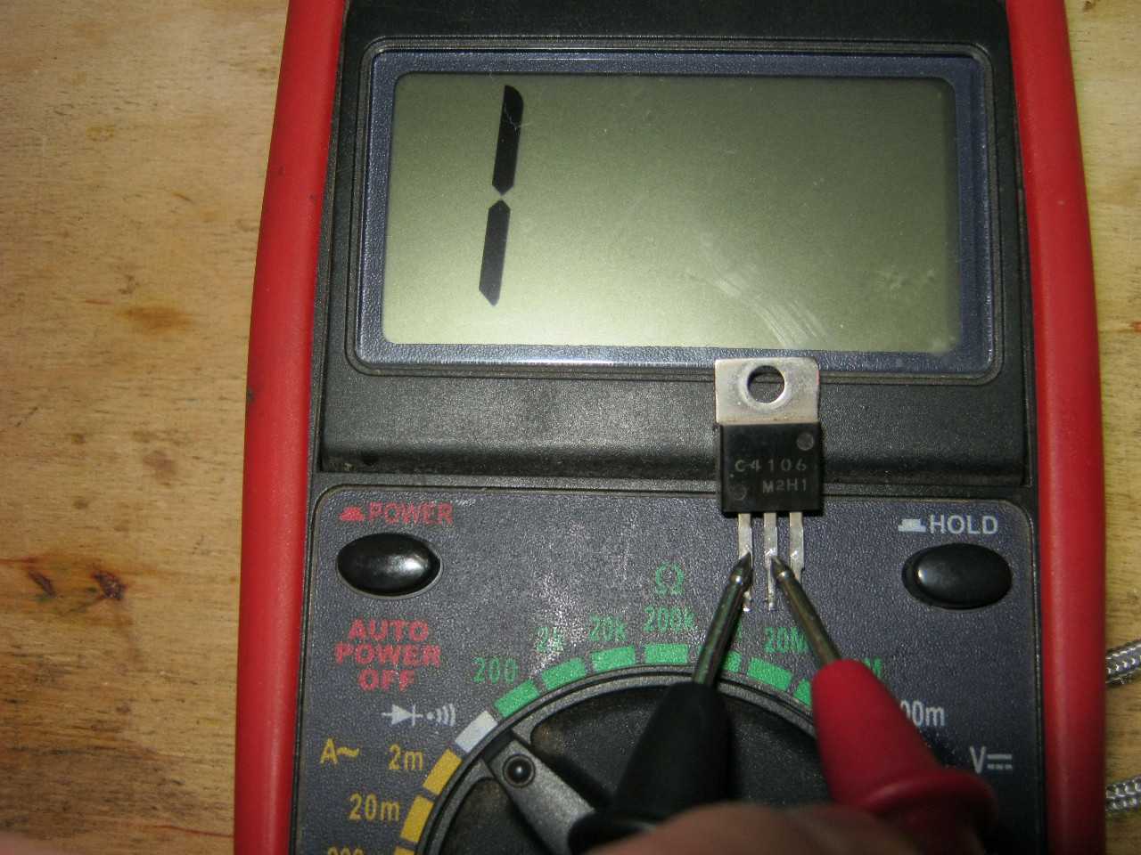Здесь у нас мультиметр также показывает единичку. Значит можно дать диагноз транзистору – здоров.