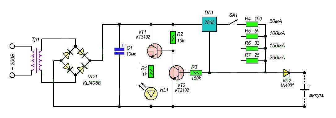 Когда аккумулятор заряжается, особое значение имеет сила тока зарядного устройства. В норме он равен приблизительно 1/10 аккумуляторной ёмкости. Постоянство этой величины, в свою очередь, обеспечивается стабилизатором 78L05.
