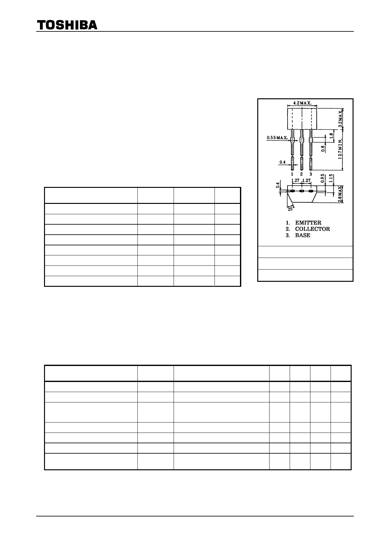 TOSHIBA Transistor Silicon PNP Epitaxial Type (PCT process) • Small package • High voltage: VCEO = −50 V (min) • High hFE: hFE = 70~400 • Excellent hFE linearity: hFE (IC = −0.1 mA)/hFE (IC = −2 mA) = 0.95 (typ.) • Low noise: NF = 1dB (typ.), 10dB (max) • Complementary to 2SC2458 Absolute Maximum Ratings (Ta = 25°C) Characteristics VCBO −50 V Collector-emitter voltage VCEO −50 V Emitter-base voltage VEBO −5 V Collector current IC −150 mA IB −50 mA JEDEC PC 200 mW Tj 125 °C Tstg −55~125 °C Electrical Characteristics (Ta = 25°C) Characteristics ICBO VCB = −50 V, IE = IEBO VEB = −5 V, IC = hFE (Note) VCE = −6 V, IC = −2 mA VCE (sat) fT Cob NF IC = −100 mA, IB = −10 mA VCE = −10 V, IC = −1 mA VCB = −10 V, IE = 0, f = 1 MHz VCE = −6 V, IC = −0.1 mA, f = 1 kHz, RG = 10 kΩ Note: hFE classification O: 70~140, Y: 120~240, GR: 200~400 Min Typ. Max Unit ⎯ ⎯ −0.1 μA ⎯ ⎯ −0.1 μA 70 ⎯ 400 ⎯ −0.1 −0.3 V 80 ⎯ ⎯ MHz ⎯4 7 pF ⎯ 1.0 10 dB 1 2007-11-01 |