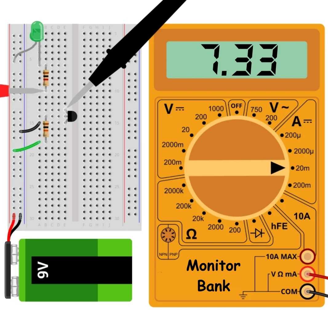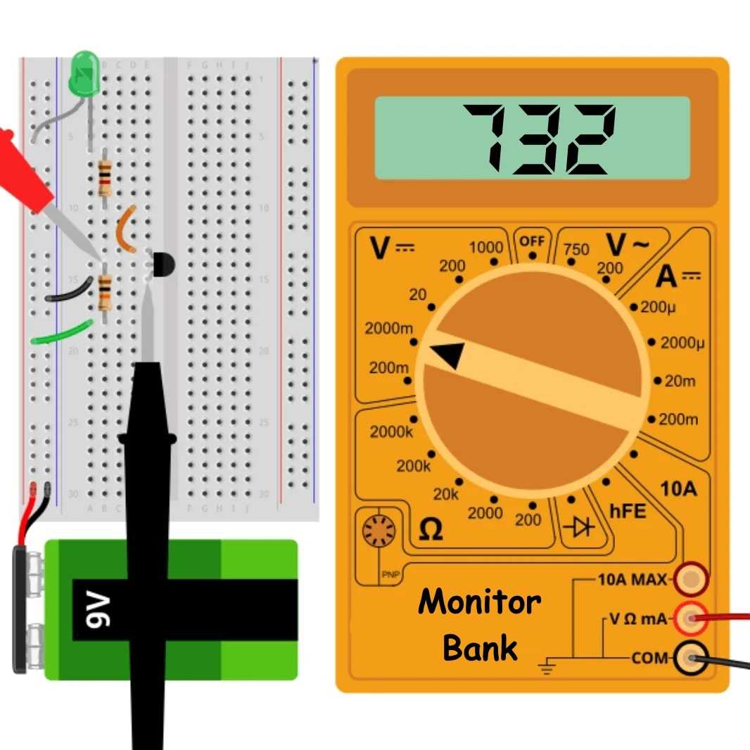 Теперь пришло время для более интересного измерения, то есть измерения силы тока. Не забудьте переместить ручку мультиметра в правильное положение и проверить базовый ток (подключив мультиметр последовательно с резистором 10 кОм ), и ток коллектора (подключив мультиметр последовательно с резистором 1 кОм). Т.к. мы ожидаем небольших значений, значит устанавливаем диапазон 20 мА.