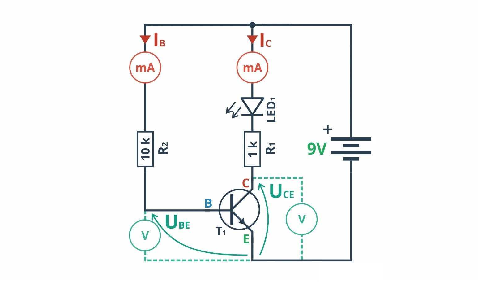 Если схема работает, на ней можно сделать несколько измерений. Сначала измеряем напряжения, показанные на диаграмме. Речь идет о напряжении между базой и эмиттером (так называемая база-эмиттер) и между коллектором и эмиттером (т.е. коллектор-эмиттер).