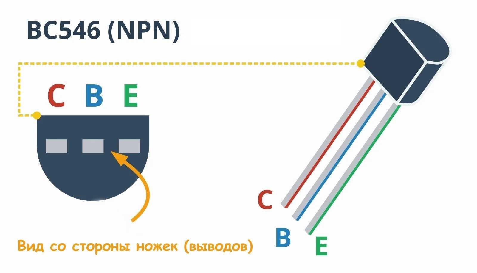 Описание выводов транзистора BC546 (слева вид снизу, т.е. со стороны выводов)