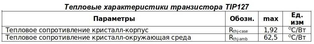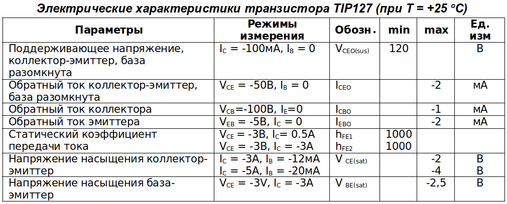 Максимальные значения параметров транзистора TIP127 компании-производители обычно указывают в самом начале технической документации. Они измеряются при температуре +25ОС. Рабочие значения должны быть меньше предельно допустимых на 20%. Рассмотрим их подробнее: