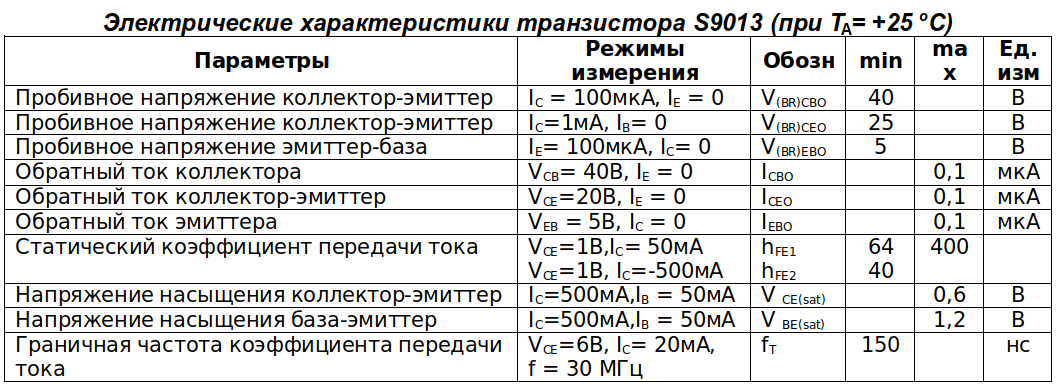 Транзистор S9013 (ТО-92) имеет такие максимально допустимые технические характеристики (при температуре окружающей среды +25ОС):