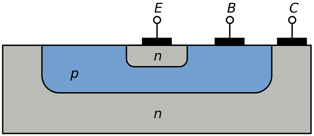 Тонкая база — «подныривает» под эмиттер. Не смотря на то, что и на коллекторе и на эмиттере — кремний легирован в тип n, отличается концентрация легирующей примеси и толщина: это делают для того, чтобы оптимизировать транзистор для «усиления тока» в одном направлении.