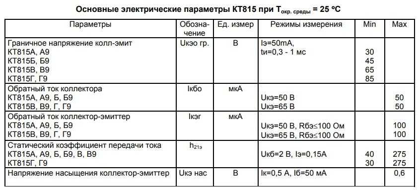 Основные электрические параметры КТ815А, при температуре окружающей среды до +25 °C (±10 °C), представлены ниже. В отдельном столбце приведены режимы измерения (тестирования в процессе производства).
