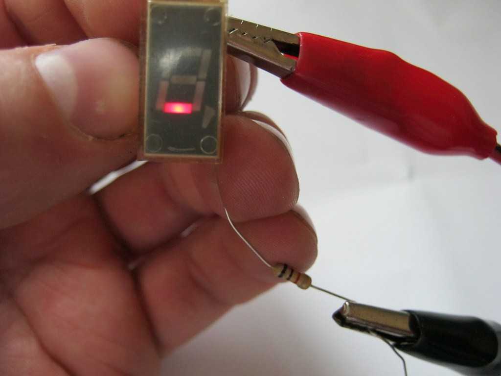 Иногда напряжения на мультиметре не хватает для проверки сегмента. Поэтому, берем блок питания, и выставляем на нем 5 Вольт. Чтобы ограничить ток через сегмент, проверяем через резистор на 1-2 Килоома.