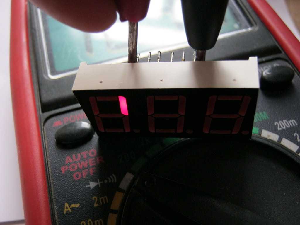 Для того, чтобы проверить современный семисегментный индикатор, нам достаточно мультиметра с функцией прозвонки диодов. Для начала ищем общий вывод — это может быть или ОА или ОК. Здесь только методом тыка. Ну а далее проверяем работоспособность остальных сегментов индикатора по схемам выше.