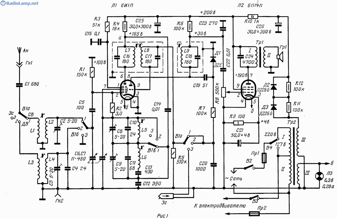 Рис. 1. Принципиальная схема супергетеродина на лампах 6И1П, 6П14П.