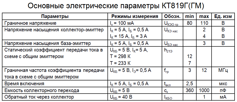 Приведем значения электрических параметров КТ819Г(ГМ,Г1). Они представлены в даташит с учётом температуры вокруг изделия не более +25oC. В графе «режимы измерения» указаны условия, при которых они были получены.
