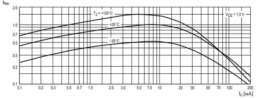 Рис. 1. Нормализованная зависимость статического коэффициента усиления по току hFE от коллекторной нагрузки IC при различных значениях температуры коллекторного p-n перехода Tj.