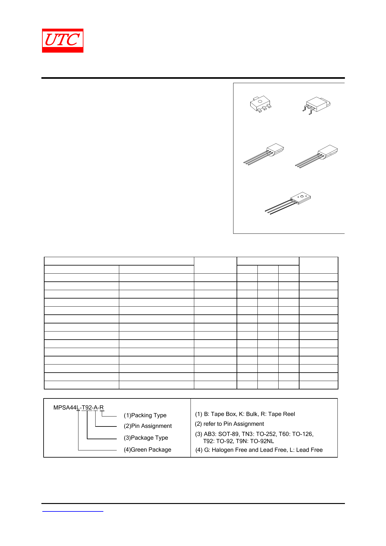 UNISONIC TECHNOLOGIES CO., LTD FEATURES * Collector-Emitter Voltage: * VCEO=400V (UTC MPSA44) * VCEO=350V (UTC MPSA45) * Collector Current up to 300mA ORDERING INFORMATION Ordering Number |