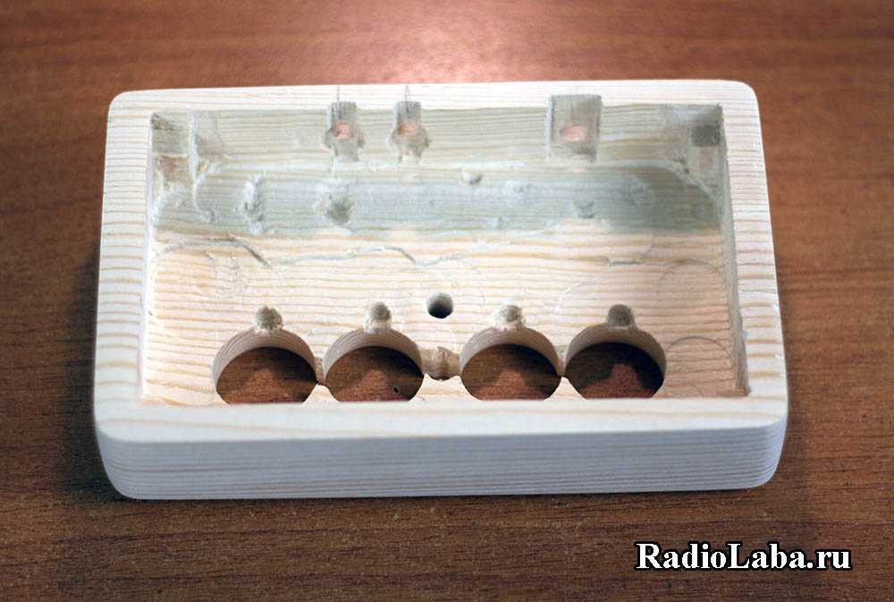 Корпус для часов я решил сделать из дерева, мне кажется, пластиковый корпус смотрелся бы скучно и не интересно. Для начала я выпилил из сосновой доски прямоугольный брусок, в котором просверлил 4 сквозных отверстия под индикаторы ИВ-11, с помощью перового сверла. Далее с нижней стороны вырезал полость, просверлил много отверстий и удалил лишнюю древесину тонкогубцами. Затем с помощью той же дрели и специальной насадки шлифовал внутреннюю поверхность полости. По внутренним углам оставил выступы, чтобы в дальнейшем закрепить плату.