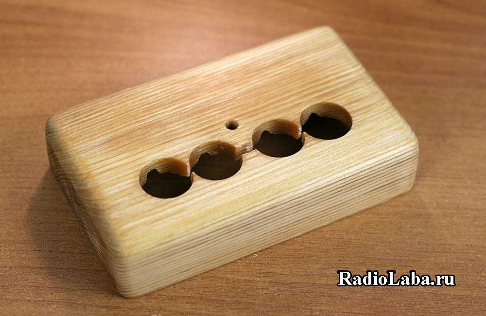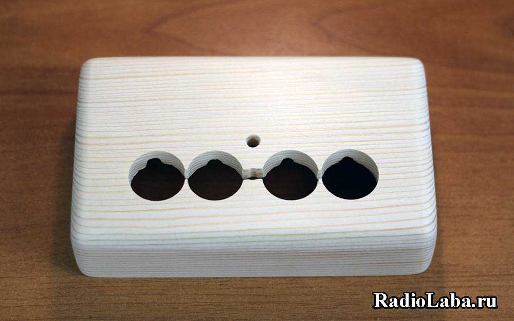 Далее по центру были просверлены отверстия под светодиод разделитель и фоторезистор, на задней стенке отверстия под разъем питания, зуммер и кнопки. Следующая стадия это скругление углов и шлифовка наружной поверхности наждачной бумагой. В результате получается готовый деревянный корпус.