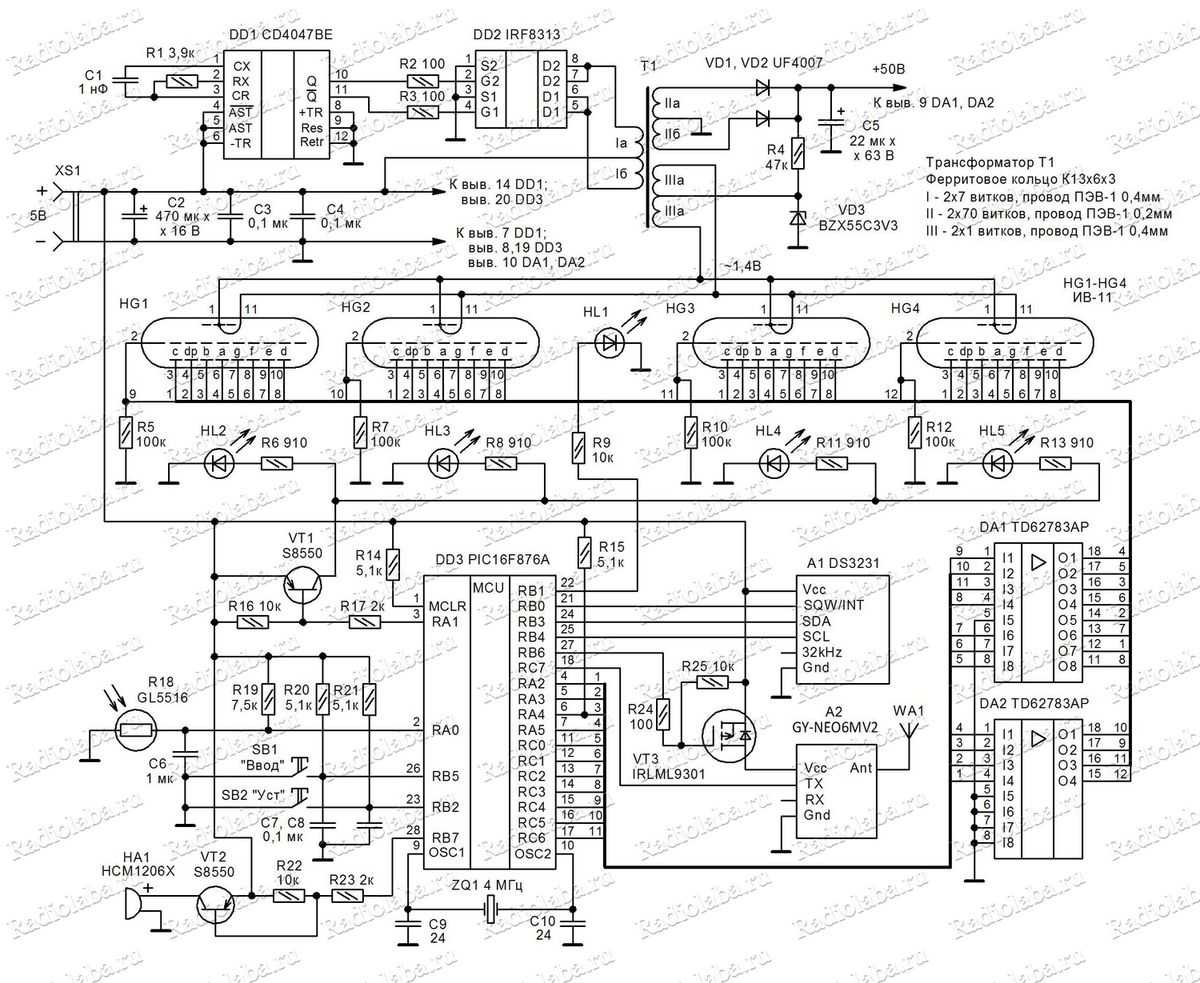 Ниже представлена схема ламповых часов на вакуумно-люминесцентных индикаторах ИВ-11: