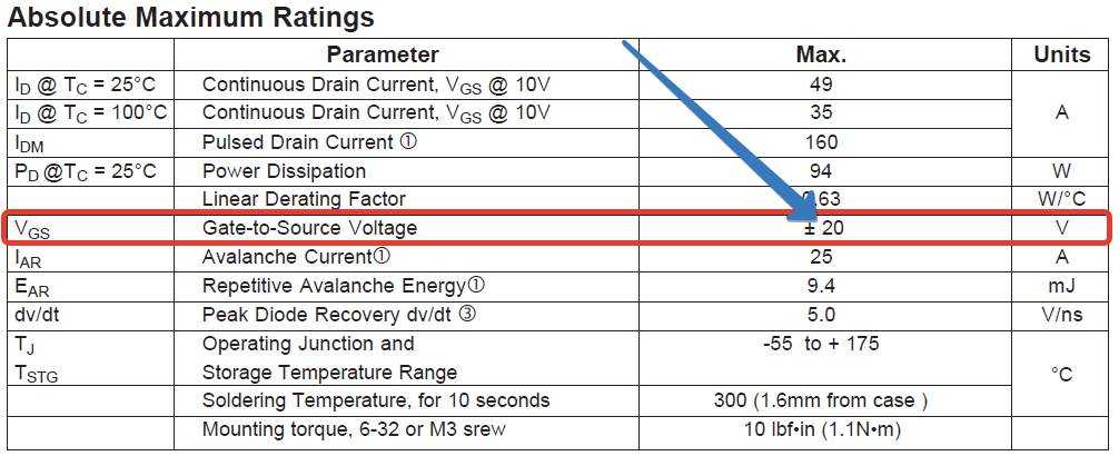 Напряжение VGS — это напряжение между Затвором и Истоком. Смотрим на даташит и видим, что максимальное напряжение, которое можно подать на Затвор это +-20 Вольт. Более 20 Вольт в обе стороны пробьет тончайший слой диэлектрика, и транзистор придет в негодное состояние.
