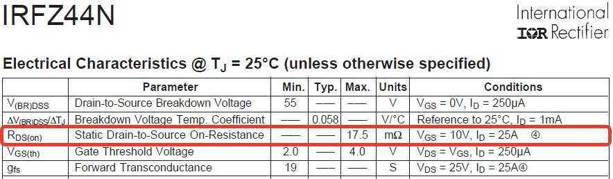 Для того, чтобы узнать характеристики транзистора, нам надо открыть на него даташит и рассмотреть небольшую табличку на первой странице даташита. Будем рассматривать транзистор, который мы использовали в своих опытах: IRFZ44N.