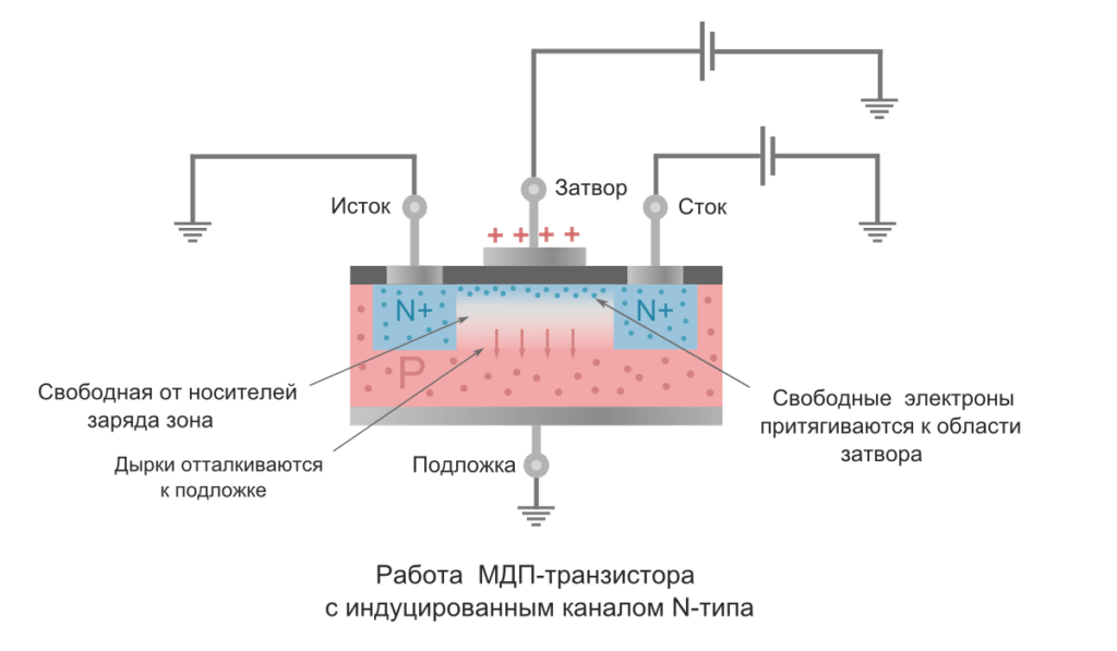 Получается однополярное устройство, в котором проводимость осуществляется движением электронов. Область между стоком и истоком образуют свободную от носителей заряда зону. Ее насыщение электронами управляется путем подачи положительного напряжения на клемму затвора.