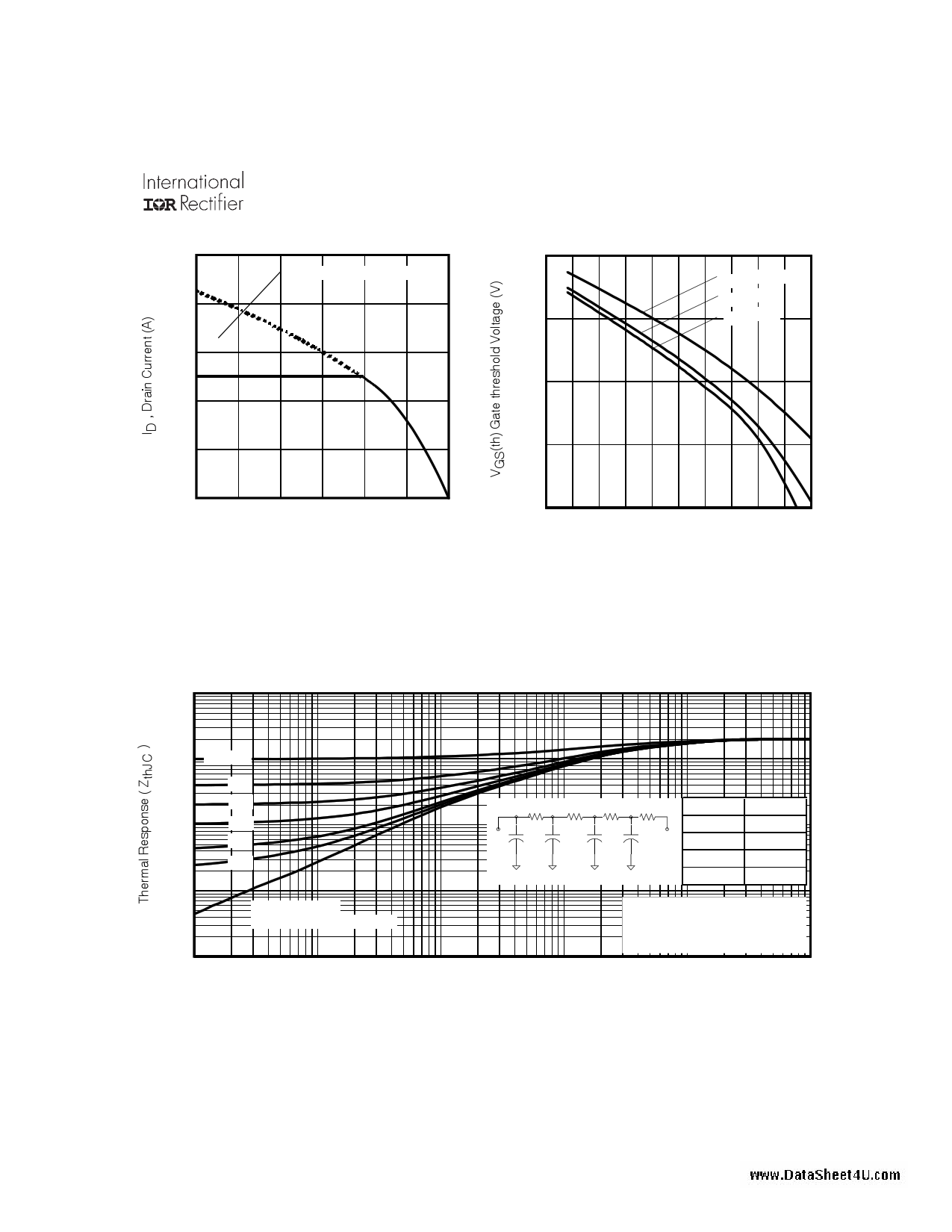 25 Fig 9. Maximum Drain Current vs. Case Temperature ID = 500μA ID = 50μA 2.0 ID = 25μA 1.5 Fig 10. Threshold Voltage vs. Temperature 10 1 D = 0.50 0.20 0.1 0.05 0.02 τJ τJ τ1 τ1 R1R1 CiC=iτiRiiRi R2R2 τ2 τ2 R3R3 R4R4 τC Ri (°C/W) τι (sec) 0.000003 τ3 τ4 τ 0.373312 0.00009 τ3 τ4 1.010326 0.000973 0.602065 0.007272 Fig 11. Maximum Effective Transient Thermal Impedance, Junction-to-Case www.irf.com Preview 5 Page |