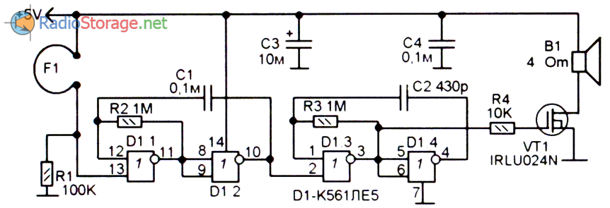 Напряжение на затвор полевого ключевого транзистора VT1 не поступает, и он остается закрытым. Ток через звуковую катушку динамика В1 не протекает. В таком состоянии ток потребления схемой минимален (менее 0.1 mA).