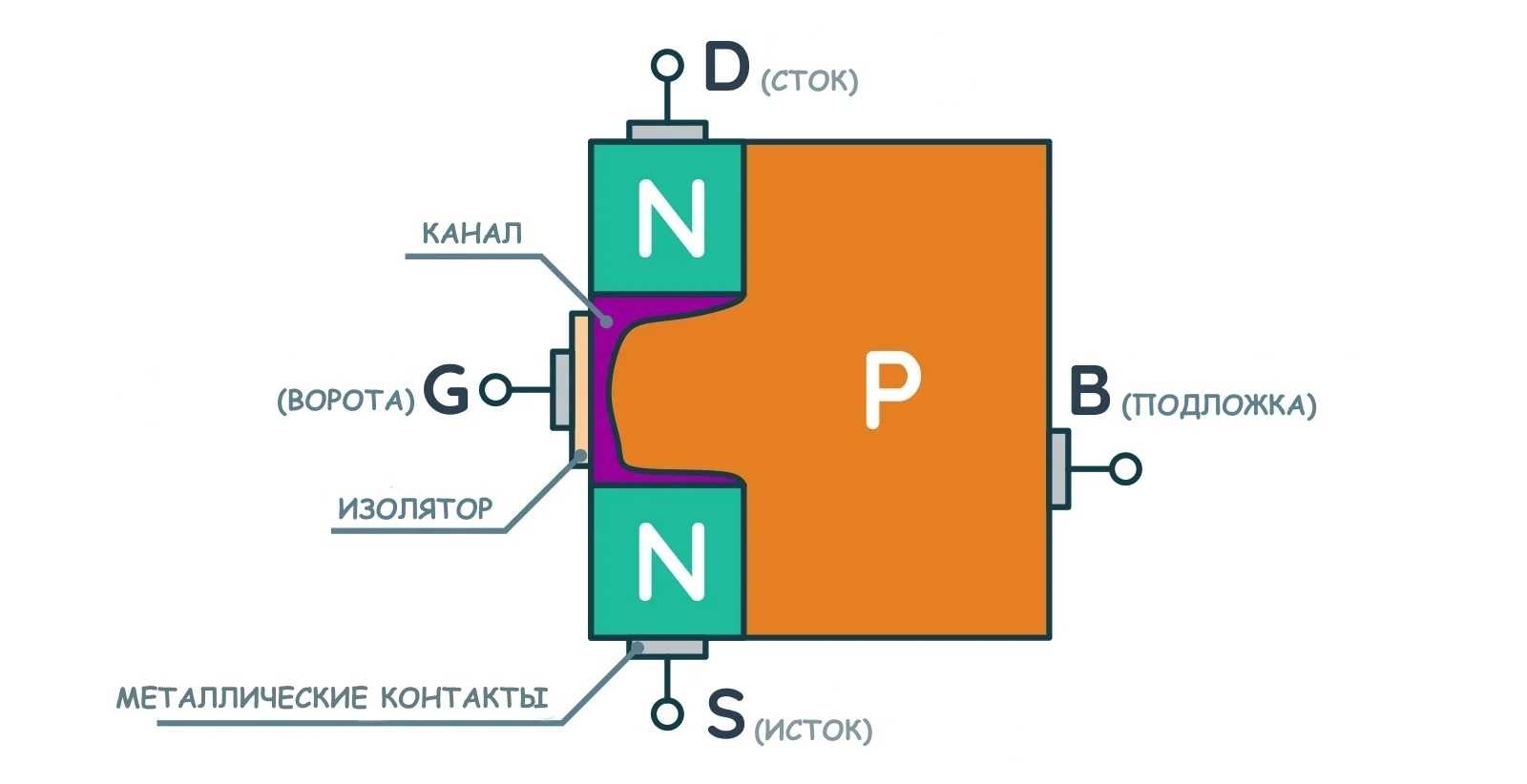 Внутренняя структура транзистора — сложная тема, но можно кратко написать, что находится внутри MOSFET:
