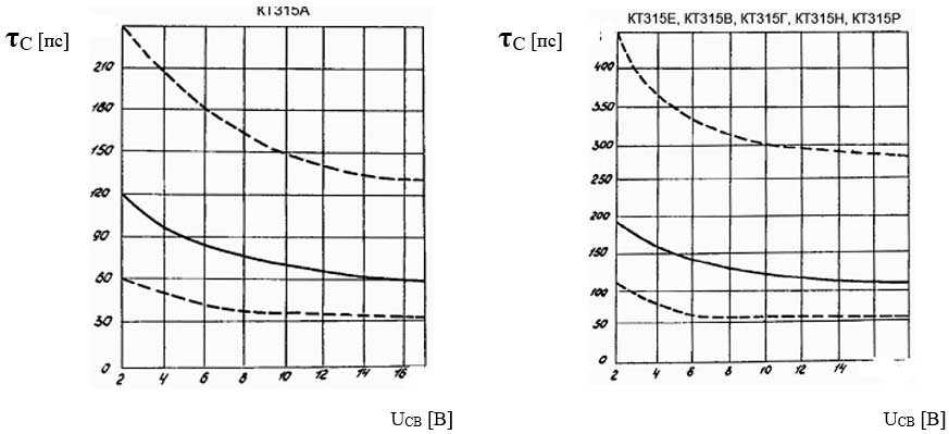 - Емкость коллекторного перехода — 7 пФ, у КТ315Ж1 — 10 пФ, у КТ315И1 — 10 пФ;