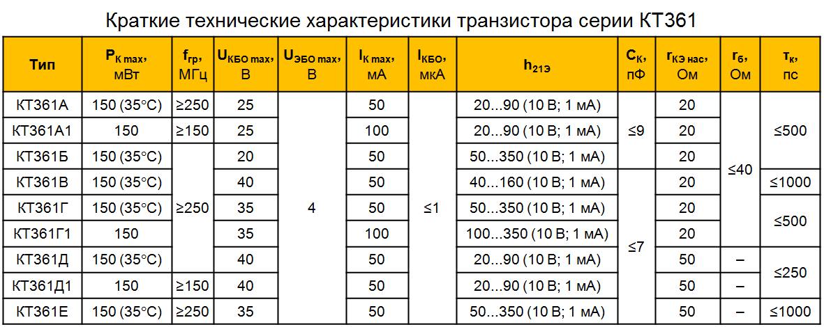 Рассмотрим максимально допустимые параметры, характерные для серии транзисторов КТ361: