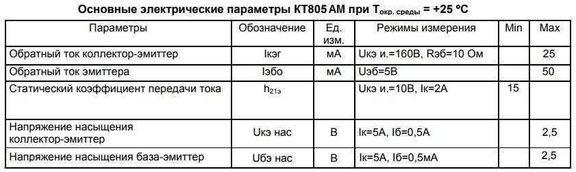 - ток базы (IБ) — 2 А; импульсный (IБ и) при tИ ≤ 20 мc — 2.5 А;