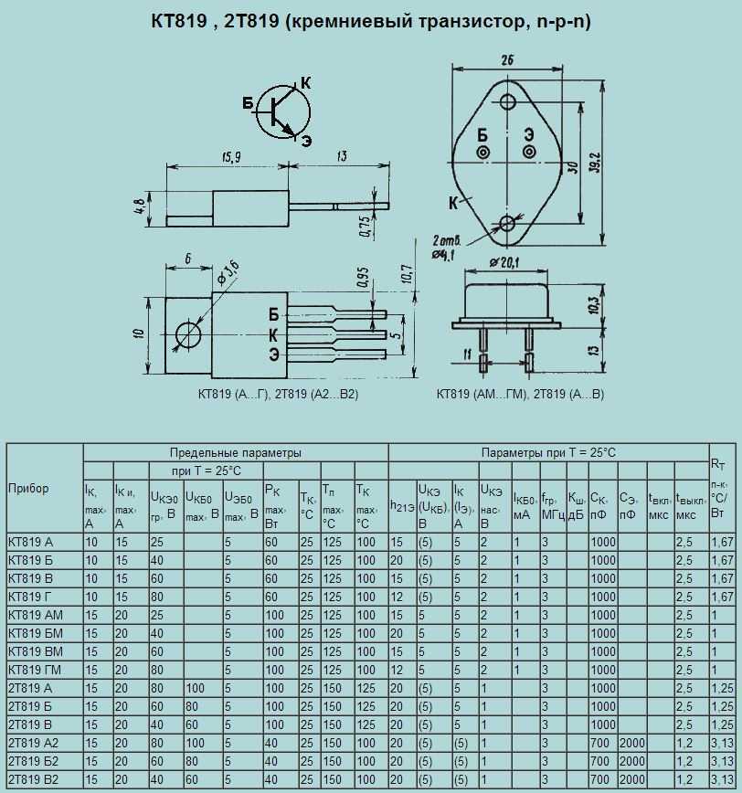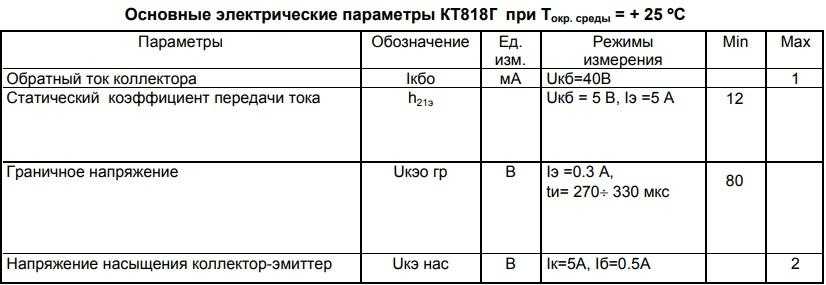 Ниже представлены основные электрические характеристики взятые из даташит на КТ818Г белорусского предприятия электронной промышленности ОАО «Интеграл». Аналогичные параметры будут и у других современных производителей. Все значения представлены для температуры окружающей среды до +25 oC.