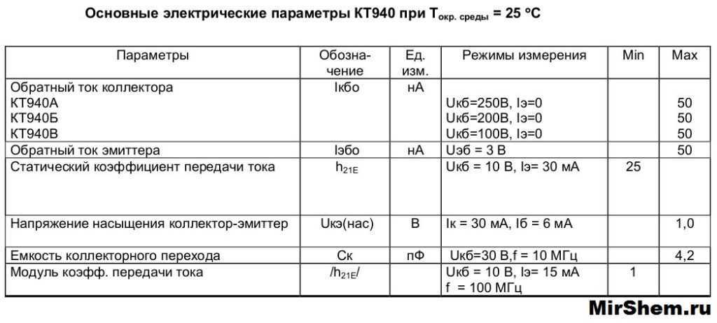 После предельно допустимых параметров в технической документации на прибор обычно идут электрические характеристики KT940А. В таблице ниже приведены эти значения при температуре +25 ОС. Остальные условия, в которых тестировался транзистор, можно найти в столбце «Режимы измерения».